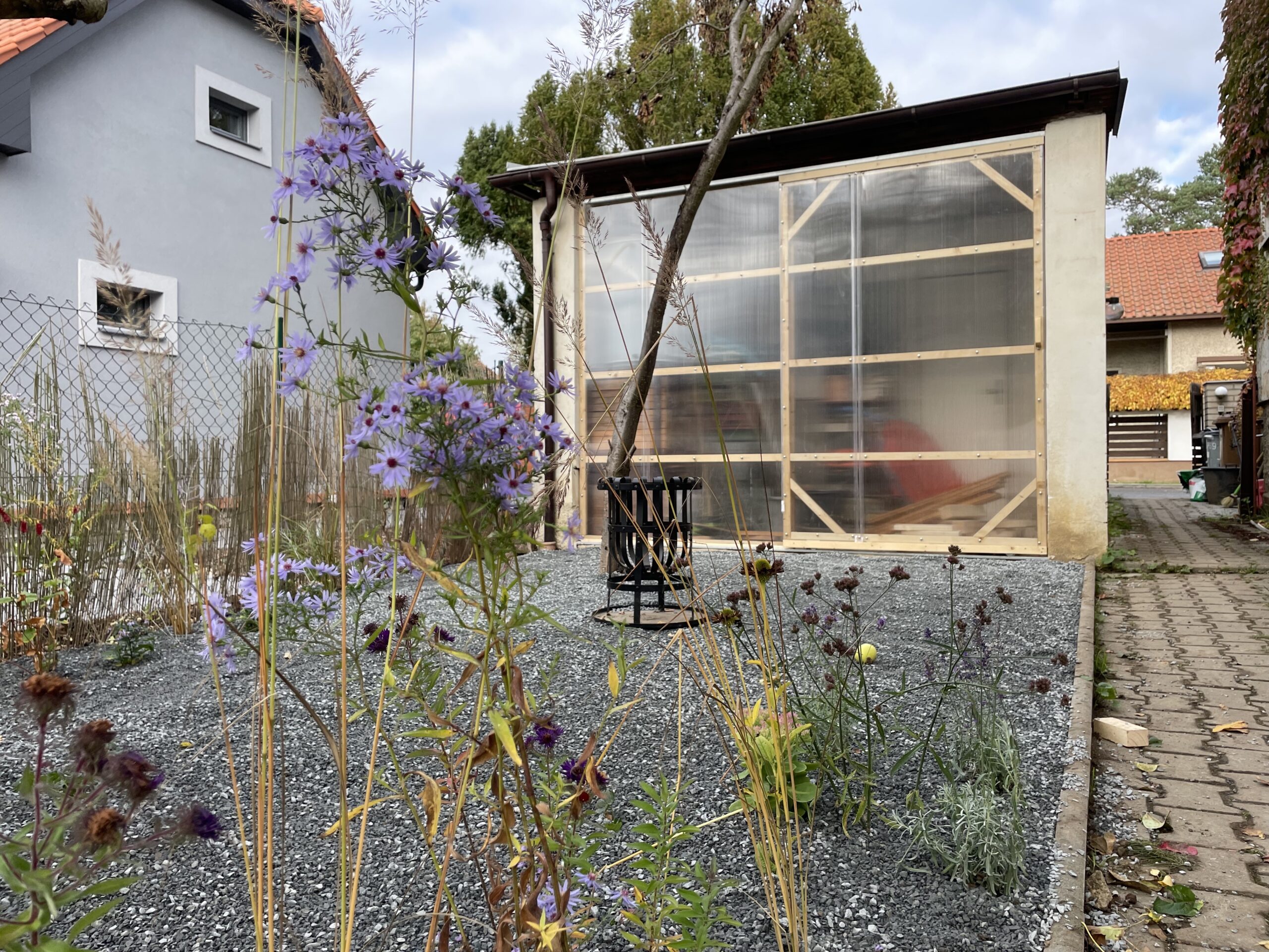Vznikla krytá „čajovna“, klidné útočiště pro chvíle o samotě. Prostor pro oheň s ohništěm a dřevníkem, obnovený skleník pro pěstování vlastní zeleniny i zahradní skříň na nářadí, která se při letních večerech mění v bar. Nechybí altán obklopený kvetoucími záhony, propojený kamennou pěšinou, ani posezení vyrobené z materiálů nalezených přímo na zahradě a v kůlně.